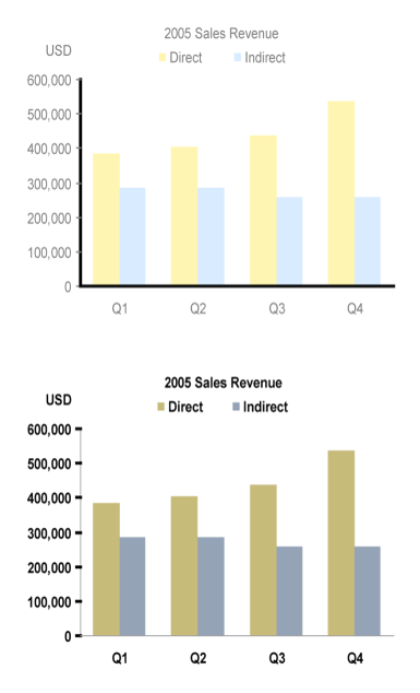 If you want different objects of the same colour in a graph to look the same, make sure that the background- the colour that surrounds them – is consistent.