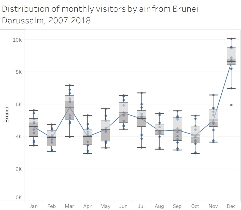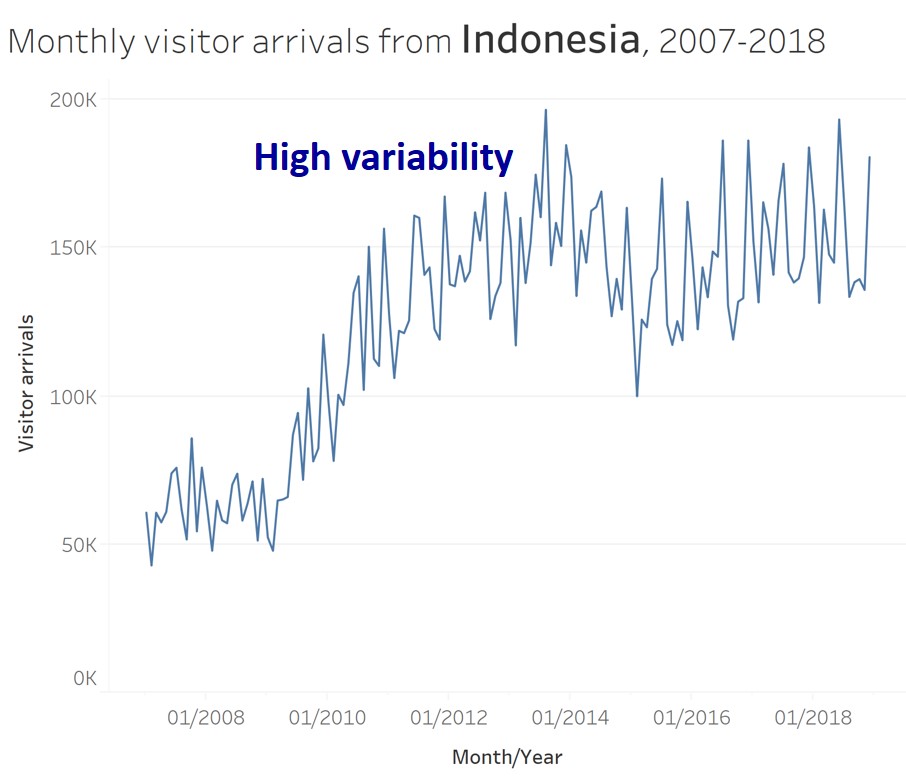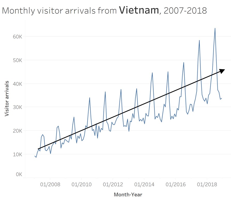 This line graph show the significant impact of SAR on the visitor arrivals pattern to Singapore.