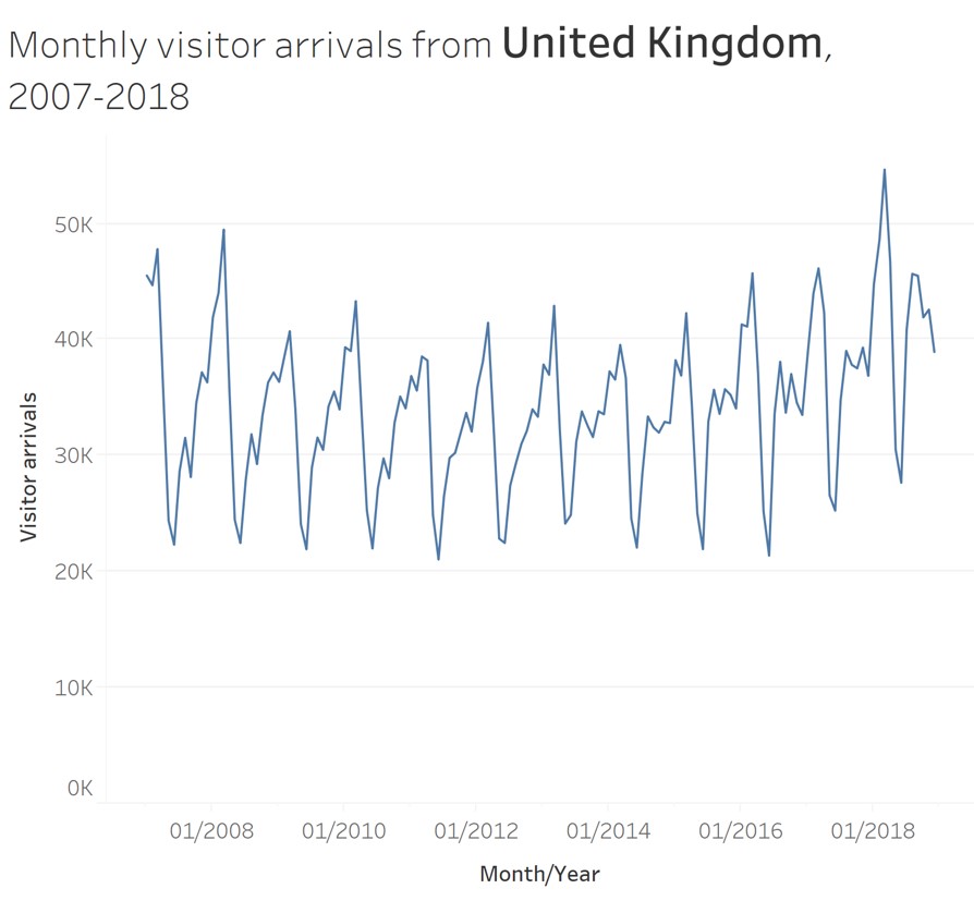 From the line graph, we can see that visitor arrivals from United Kingdom reach its peak on January and lowest on May every year.