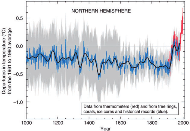 Reference: Michael E. Mann, Raymond S. Bradley, Malcolm K. Hughes (1999) “Northern hemisphere temperatures during the past millennium: Inferences, uncertainties, and limitations”. Geophysical Research Letters, Vol. 26, No. pp. 759-762.