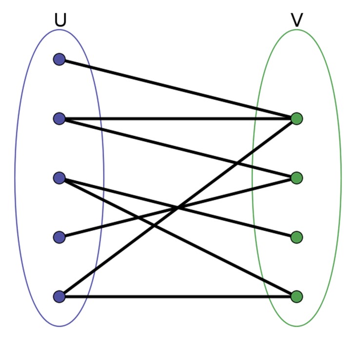 A graph whose vertices can be divided into two disjoint sets U and V such that every edge connects a vertex in U to one in V; that is, U and V are independent sets.