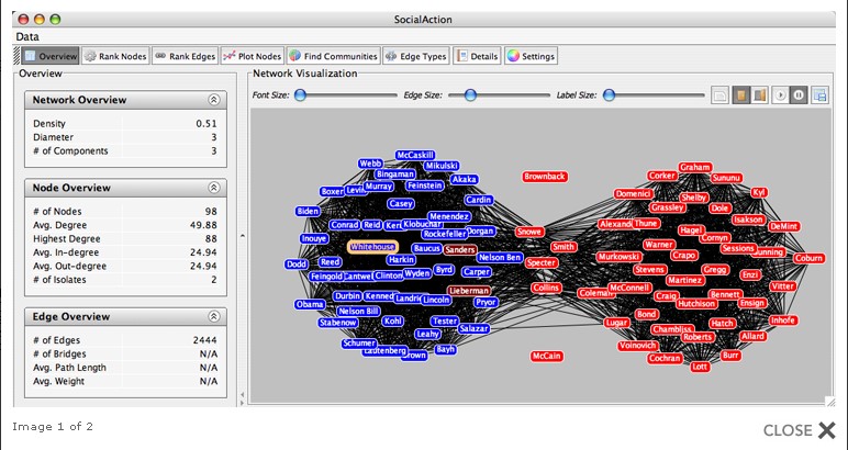 Graph visualisation is used to reveal voting patterns among United States senators.