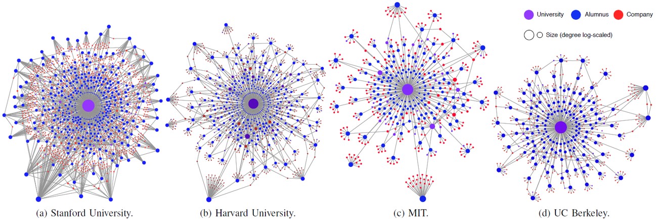- Networks of the below universities are expanded in a breadth first manner up to the depth of 2, (showing university, alumni and companies they are associated with through employment, investment or other activities)