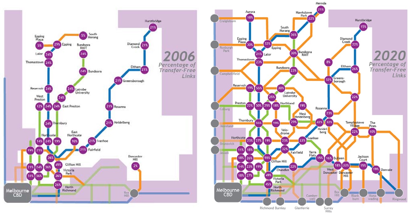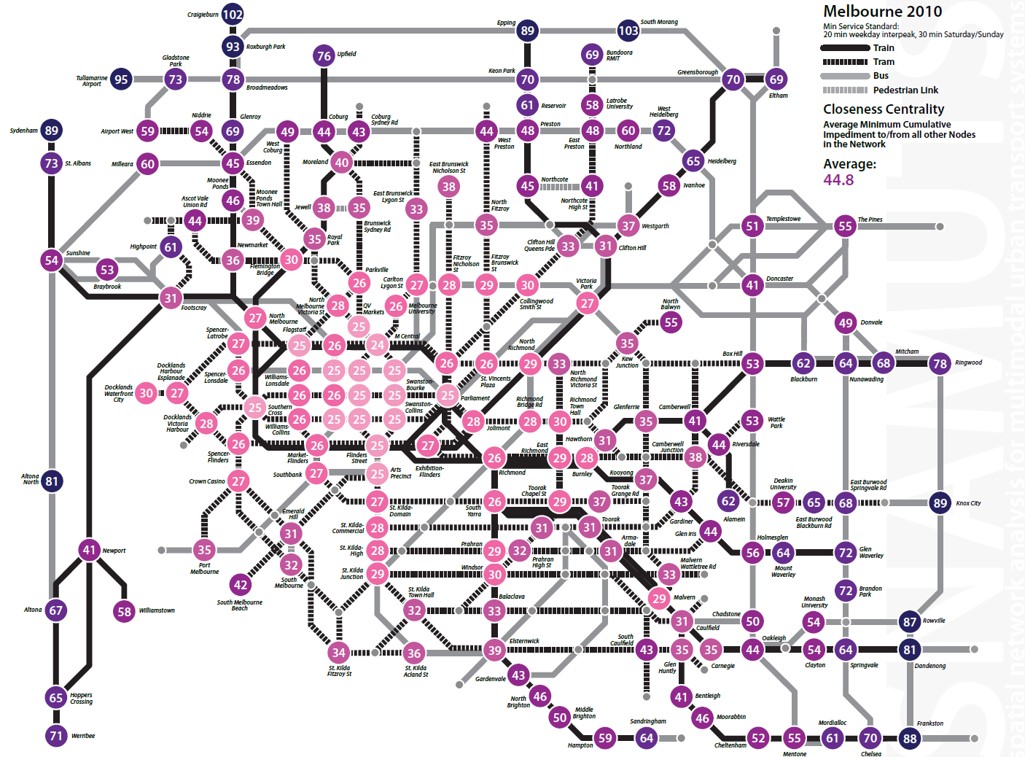 - Degree centrality indexes for nodes in the existing (2006) and proposed (2020) public transport networks in Melbourne’s north-east
