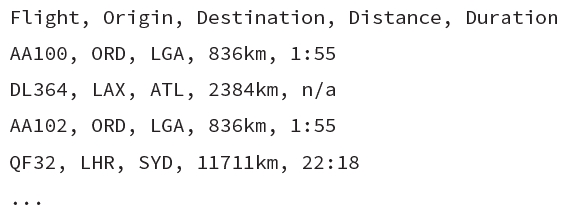 The record indicates the city pair (that is, a link), such as ORD–LGA or LAX–ATL. Note that this particular data has directed links. ORD–LGA is a flight that starts in Chicago’s O’Hare Airport and ends at LaGuardia Airport in New York City and is different from LGA–ORD, which is a flight going in the other direction. Both links are valid.