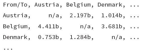 - Sometimes a matrix of data contains the same entries in both the first column and first row. For example, global trade flows between countries can be represented as a table of numbers (http://stats.oecd.org).