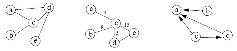 On the left is a normal graph, in the centre is a graph in which each edge is given a numerical value, and to the right is a directed graph.