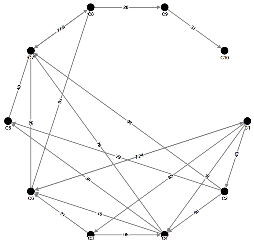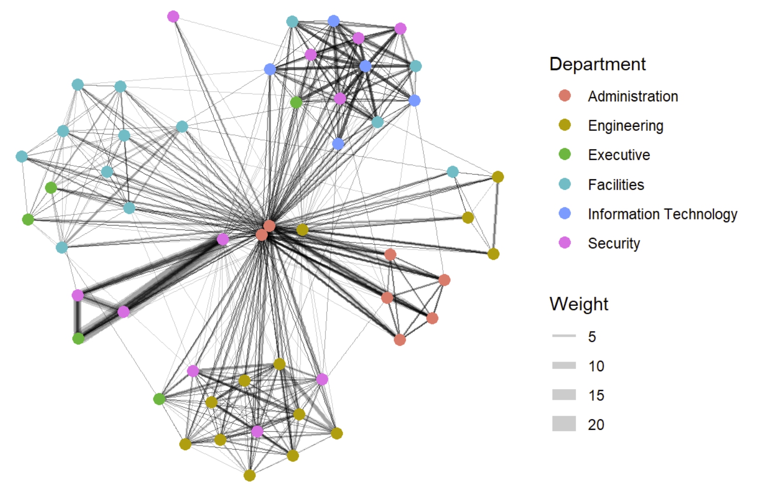 - A weighted edge includes values associated with each edge that indicate the strength or frequency of tie. For example, numbers of calls between two staffs.