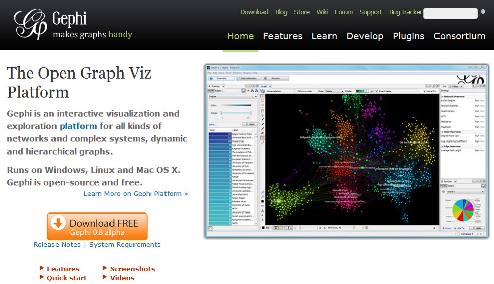 Gephi, an open source network graph visualisation and analysis toolkit.