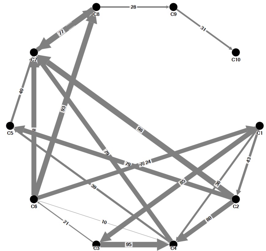 - Edges with different thickness are used to represent the monthly calls by staffs.